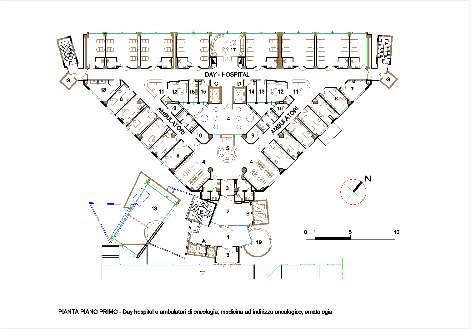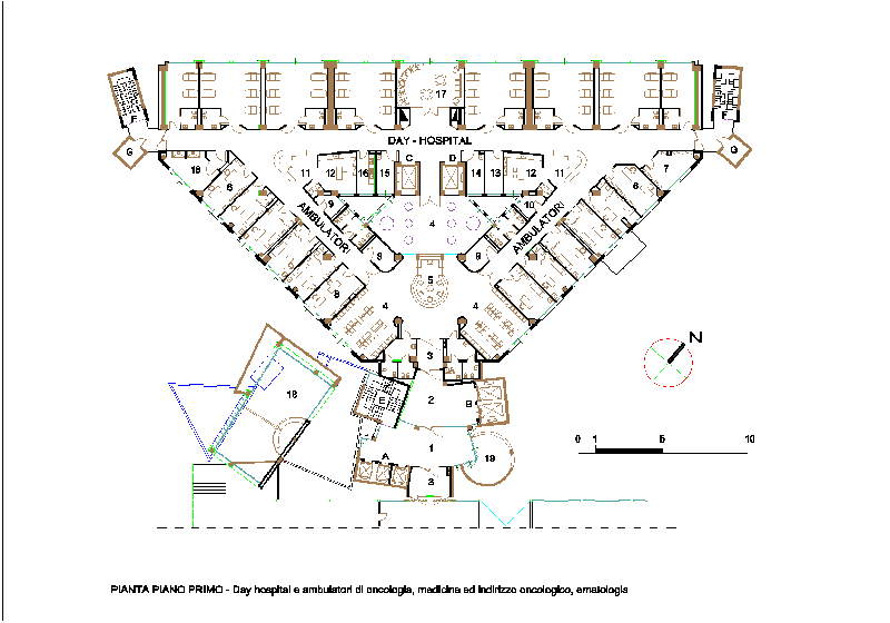 - - Pianta del piano primo destinato a day-hospital e ambulatori di oncologia, medicina ad indirizzo oncologico ed ematologia.