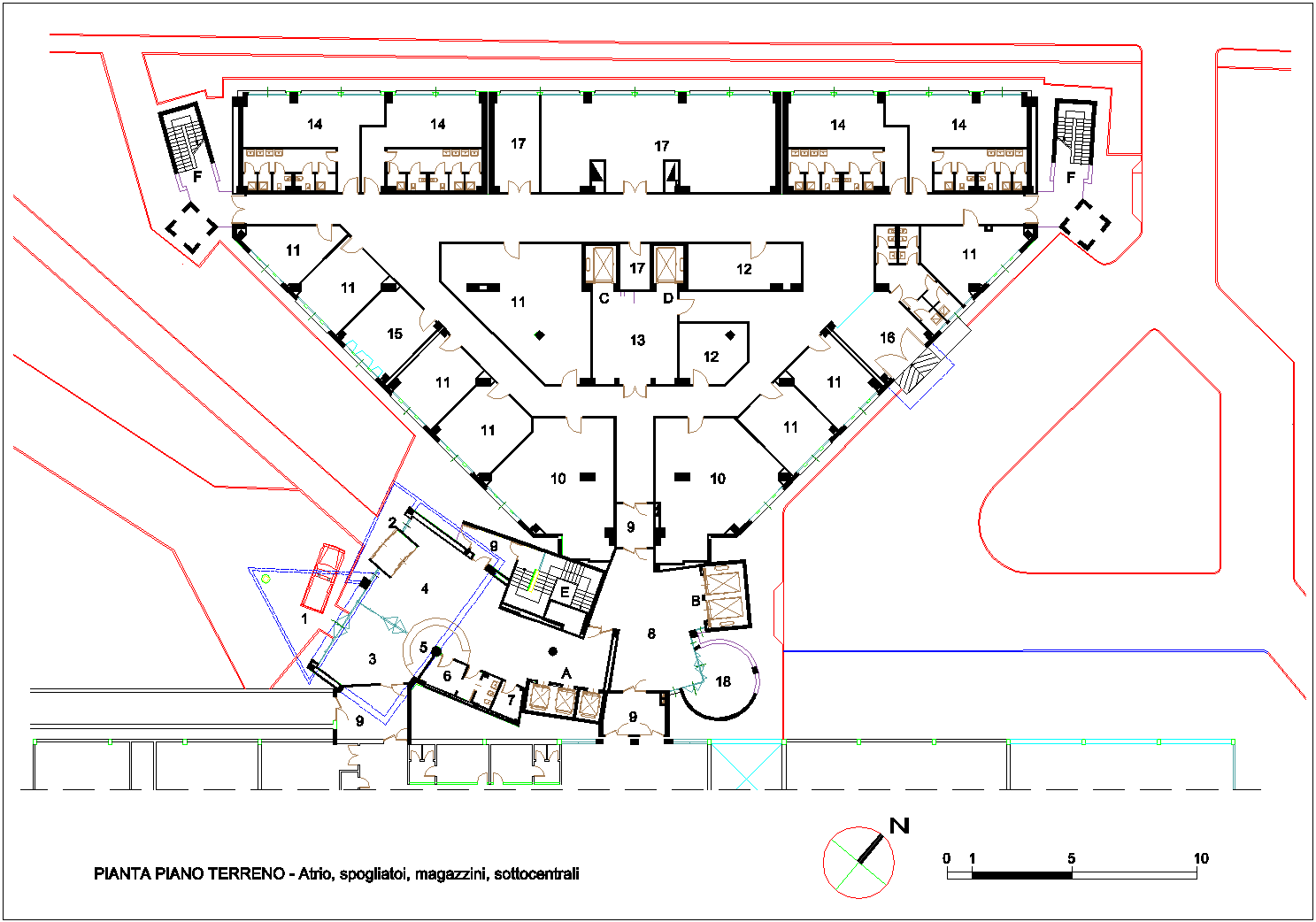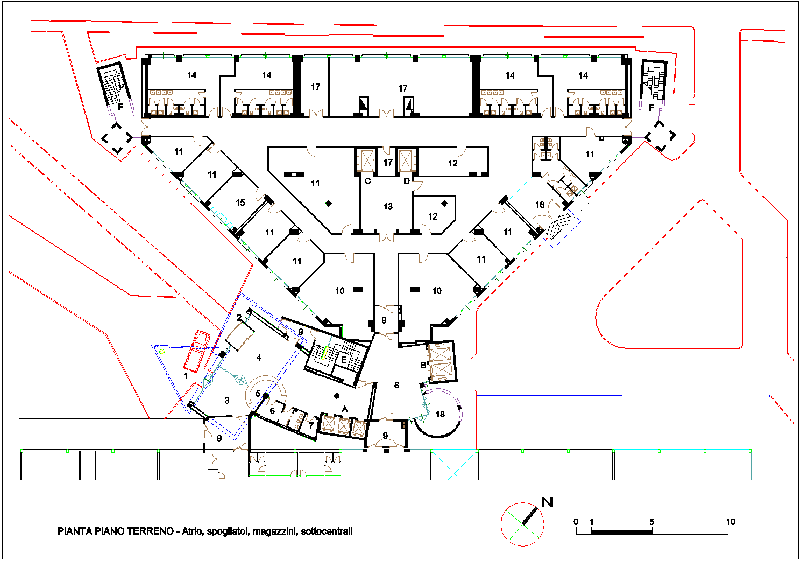- - Pianta del piano terreno destinato a atrio, spogliatoi, magazzini e sottocentrali tecnologiche.