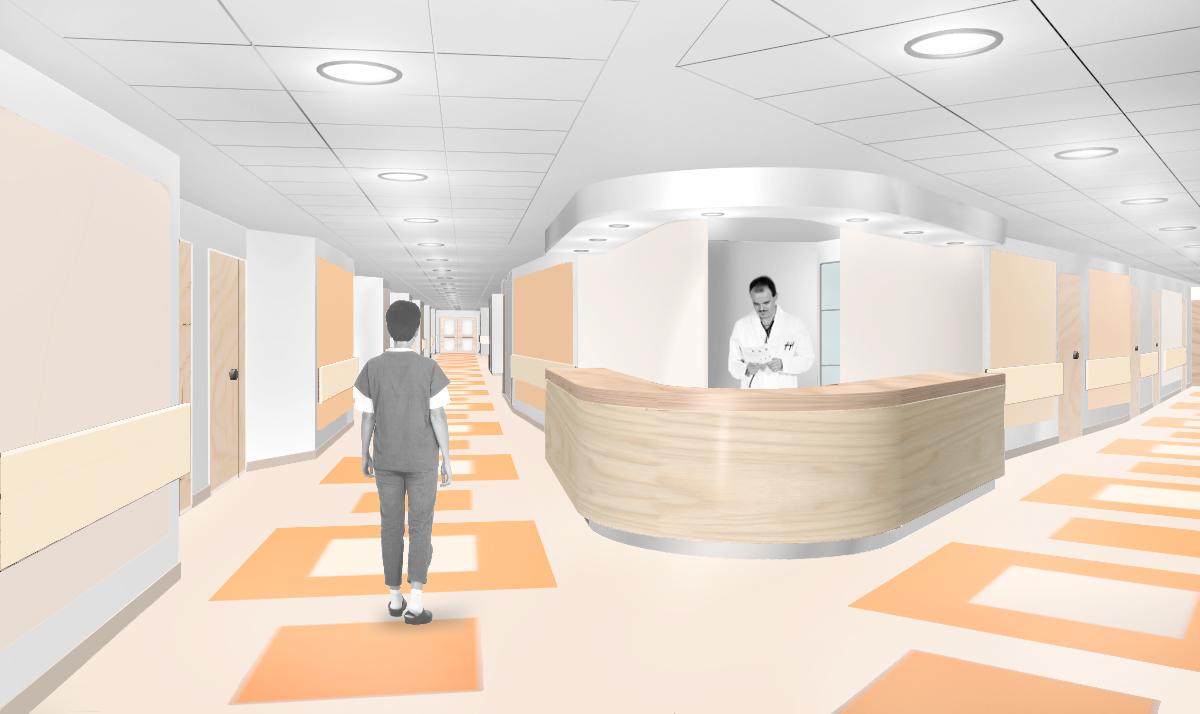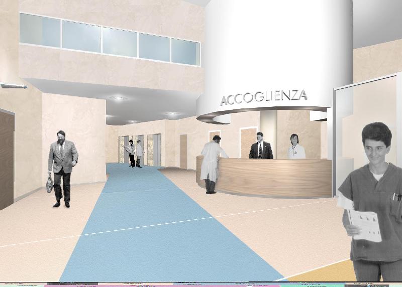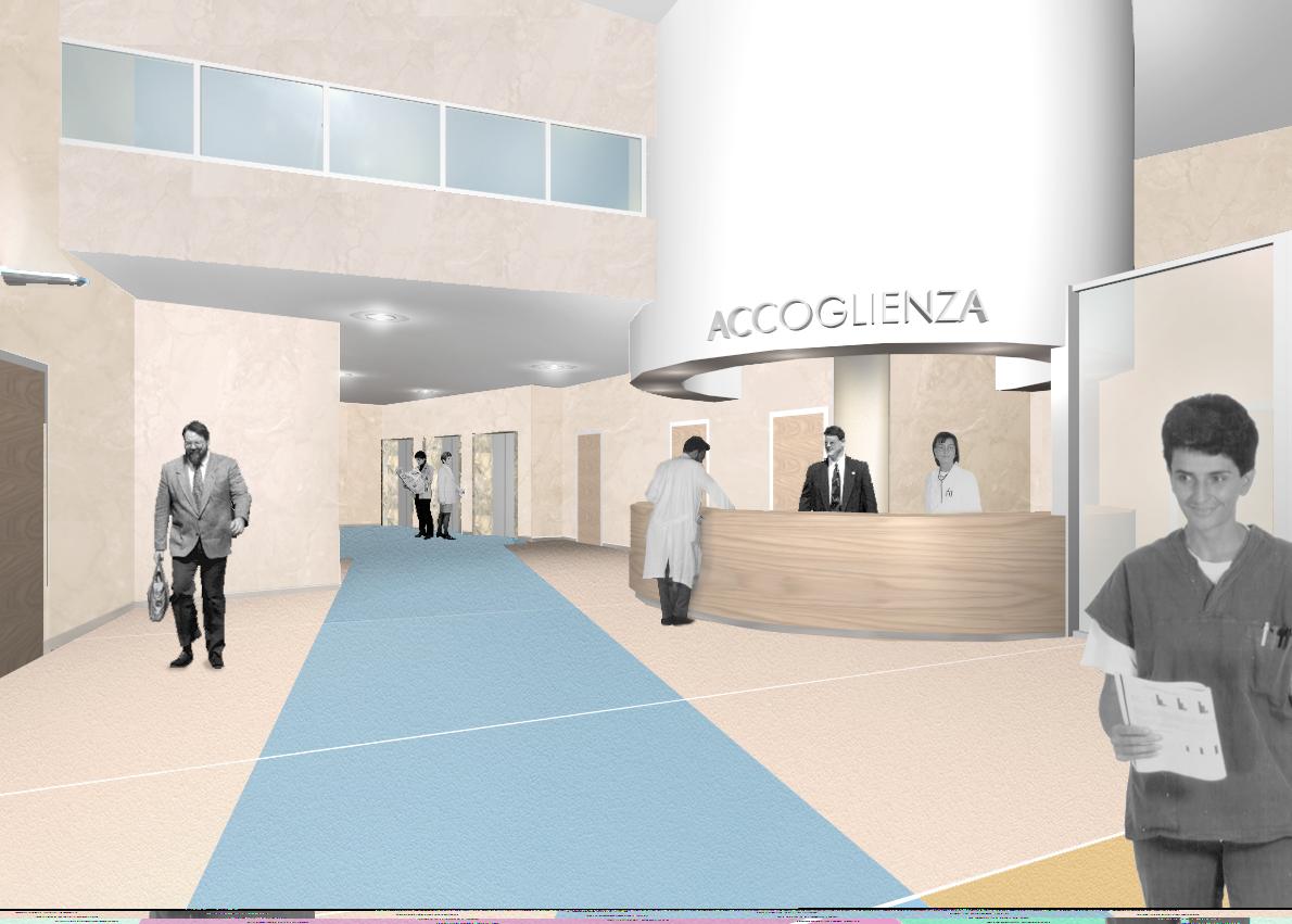 - - Rendering a computer. Vista della postazione di controllo angolare dei piani di degenza.