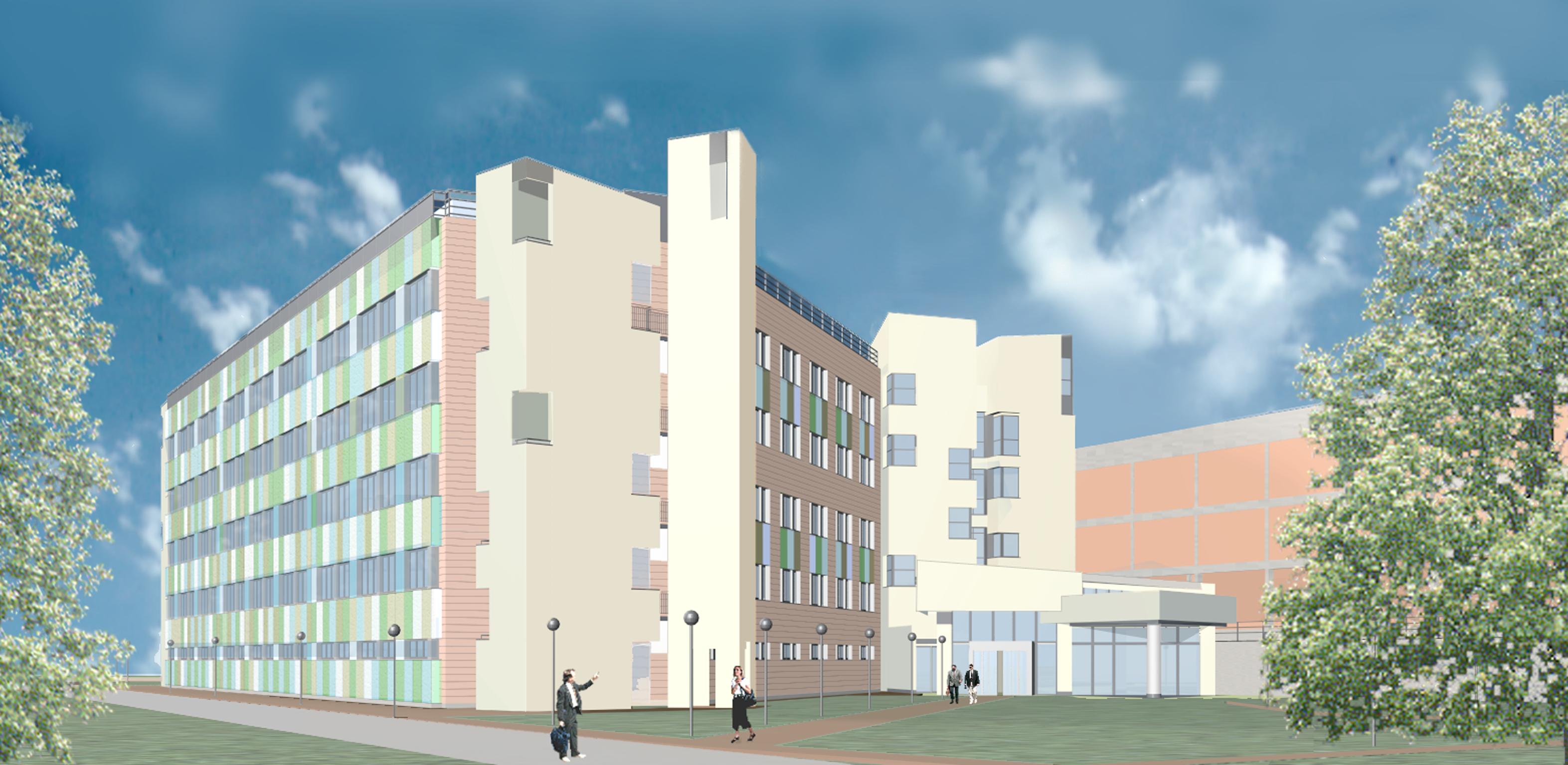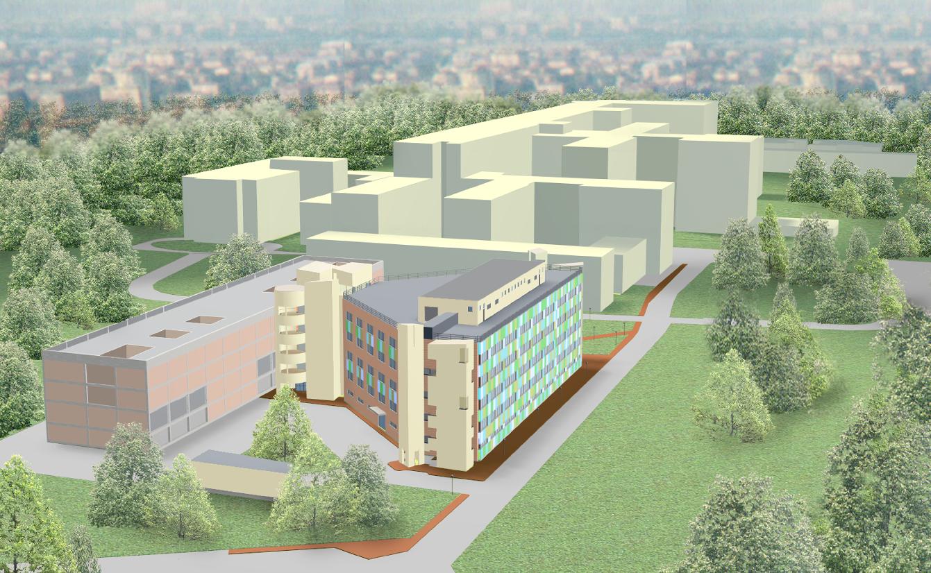 - - Rendering a computer. Vista dallalto da nord del nuovo edificio inserito nel contesto degli edifici esistenti del Policlinico.