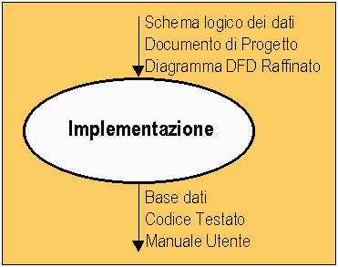 La fase di Implementazione riceve in input, dalla Progettazione, il Documento di Progetto, il DFD, lo Schema Logico dei Dati e produce in output la Base di Dati, il Codice Testato e il Manuale Utente dell’intero progetto come schematizzato in Figura 6.4.1.