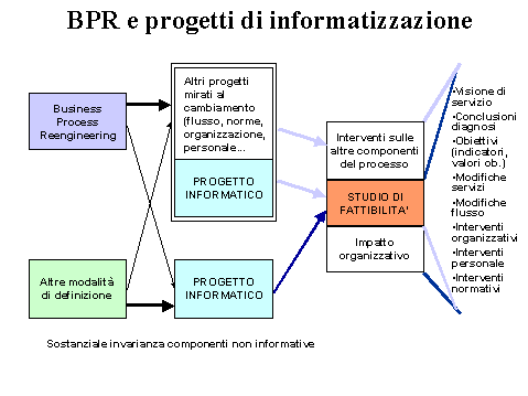 La figura seguente illustra i due percorsi indicati, evidenziando come comunque, nella definizione di un progetto informatico, sia necessario assumere un punto di vista complessivo sul processo (o sull’insieme omogeneo di processi su cui ci si propone di intervenire), esplicitando gli obiettivi di miglioramento ed indicando le necessarie iniziative collaterali all’intervento informatico.