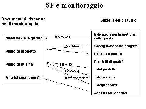 Anche ai fini del monitoraggio è pertanto importante che tali requisiti vengano espressi in relazione alle caratteristiche di qualità di cui agli standard "ISO/IEC 9126:1991-Information technology -- Software product evaluation -- Quality characteristics and guidelines for their use" per quanto riguarda i prodotti software mentre, per quanto riguarda i servizi, siano coerenti a quanto contenuto nei documenti di "specifiche del servizio", di "specifiche di realizzazione del servizio" e di "specifiche controllo qualità del servizio" di cui alla norma "ISO 9004-2:1991 - Quality management and quality system elements -- Part 2: Guidelines for services".
