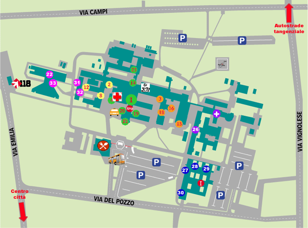 Il Policlinico è sito in via del Pozzo, 71 41100 Modena a lato della via Emilia in direzione Bologna.