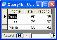 WHERE p.nome=padre and f.nome=figlio and f.eta>30 GROUP BY p.nome) WHERE reddito_medio>20;