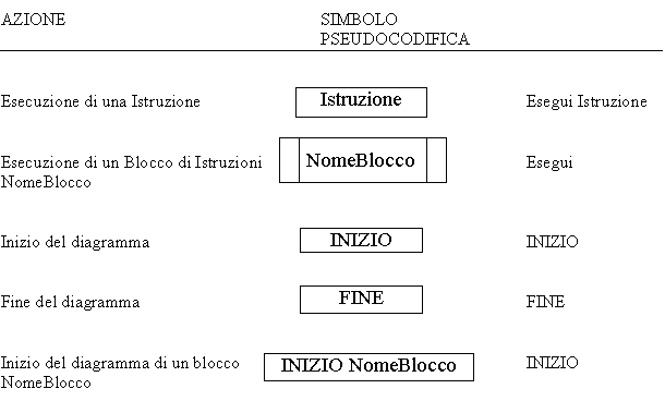 In questa parte vengono proposte le figure che all’interno di un diagramma di flusso rappresentano una azione e la corrispondente struttura letterale associata per la pseudocodifica.