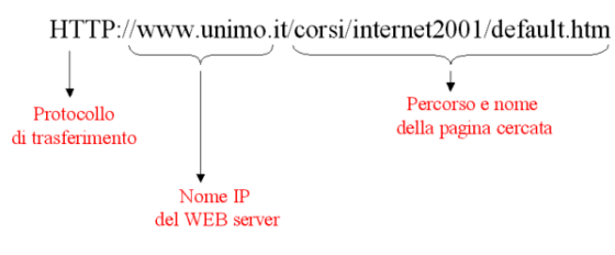 Il ViaggioIniziare a "navigare" sul web. Non esiste un punto di partenza principale per consultare il web. Quando si lancia il browser può aprirsi una pagina (pagina iniziale) che dipende dalla configurazione locale del proprio computer e da cui iniziare la consultazione.Accesso diretto a una risorsa WEBPer accedere a una pagina specifica bisogna indicare al browser il corretto indirizzo internet della pagina desiderata. L'indirizzo viene detto URL e ha la forma seguente: