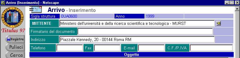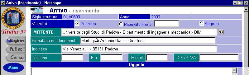 Al fine di non creare doppioni o anagrafiche multiple relative ad un medesimo ente, Titulus 97 ha introdotto due campi: Firmatario e Alla cortese attenzione. Il primo si riferisce alla corrispondenza in arrivo, il secondo a quella in partenza o interna. Il loro utilizzo eviterà di creare doppioni del tipo Comune di Padova e Comune di Padova - Sindaco, oppure peggio Sindaco del Comune di Padova.