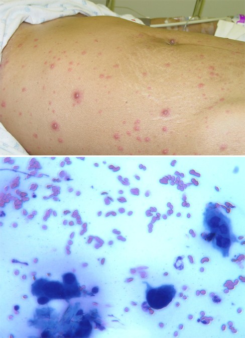appear on the face, trunk, and abdomen but not palms or soles. A CT