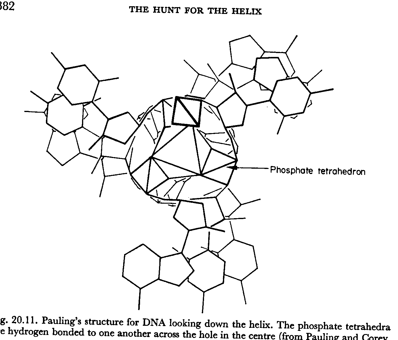 "Their model consists of three intertwined chains, with the phosphates near the fibre axis, and the bases on the outside."