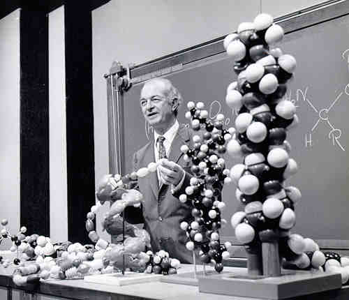Linus C. Pauling (1901-1994) was one of the most important scientists of the 20th century. He did a great deal of important work on chemical bonds and protein structures, and his chemistry text (The Nature of theChemical Bond, 1939) was relied upon heavily by Watson and Crick for reference. Some of Pauling's most important work utilized X-ray crystallography to aid the structural determination of biological molecules. He recieved the Nobel Prize for Chemistry in 1954, and the Nobel Peace Prize in 1963. He also pioneered model building method of structural determination used by Watson and Crick, and by which he had elucidated the structure of the alpha helix. Plausable 3-dimensional models could be built from knowledge of chemical bonding and bond distances to fit experimental data.