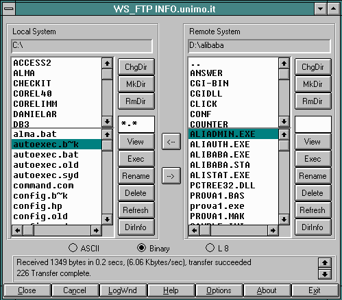 Binary: consente di scambiare file, con formati particolari, senza che questi vengano alterati. In pratica la modalità Binary fa una fotocopia del file. Utilizzato per trasferire file: EXE, GIF, JPG, ZIP, DOC...