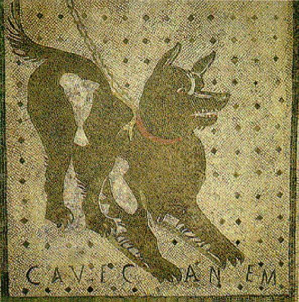 Mosaico pavimentale nella Casa del Poeta Tragico, a Pompei con cane e la scritta