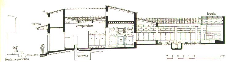 Sezione della casa di Trebio Valente a Pompei che mostra il sistema idraulico della casa, direttamente collegato all'acquedotto.