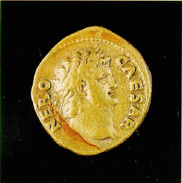Aureo con l'effigie di Nerone.I secolo d.C. La moneta è stata trovata recentemente a Ercolano. Torre del Greco,deposito della Banca Popolare