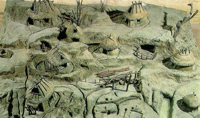 Plastico ricostruttivo del villaggio di capanne che sorgeva nel IX-VIII secolo a.C. sul colle Palatino a Roma. Roma , Antiquarium del Palatino