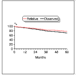 The observed and relative 5-year survival for breast cancer was 70% and 78%, respectively.