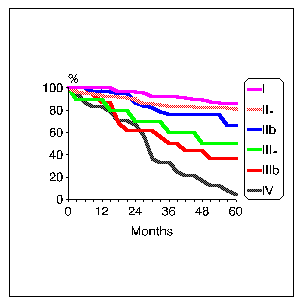 The five year observed survival was 86%, 81%, 66%, 50%, 38%, 4% for women with stage I, IIA, IIB, IIIA, IIIB, IV, respectively.