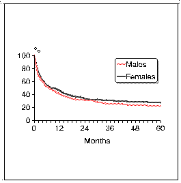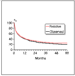 | Stomach cancer. Observed and relative survival, years 1988-1991. | Stomach cancer. Relative survival by sex, years 1988-1991. |