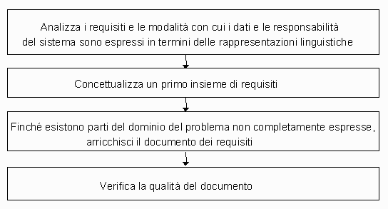 È dunque conveniente effettuare una analisi dei requisiti preliminare alla fase di concettualizzazione, in cui l’attenzione è posta sui requisiti e sul modo in cui sono strutturati, senza ancora prefigurare la loro espressione in termini del modello concettuale.