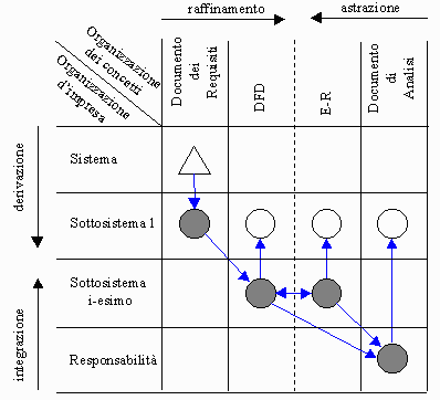 Sulla coordinata dell’ascissa, attinente all’organizzazione dei concetti, compaiono i seguenti elementi: il documento dei requisiti, che rappresenta il collegamento con la fase precedente di analisi e definizione dei requisiti; il diagramma E-R; il DFD ed il documento di analisi. Questi ultimi rappresentano i prodotti della fase di analisi, proposti ad un livello di dettaglio opportuno.
