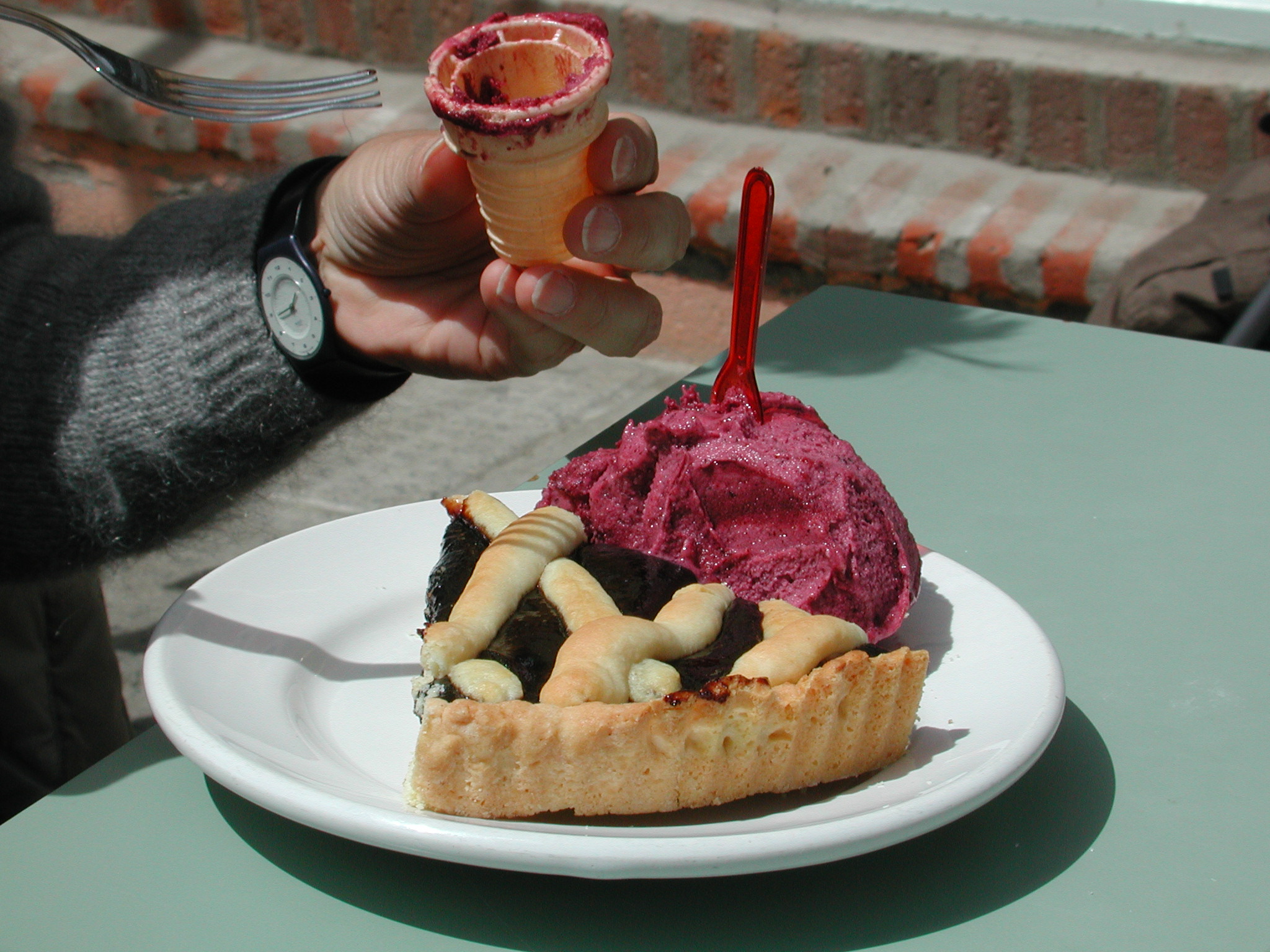 Pranzo a base solo di calafate: torta della nonna con marmellata di calafate e gelato di calafate. Buonissimi anche se dolci.