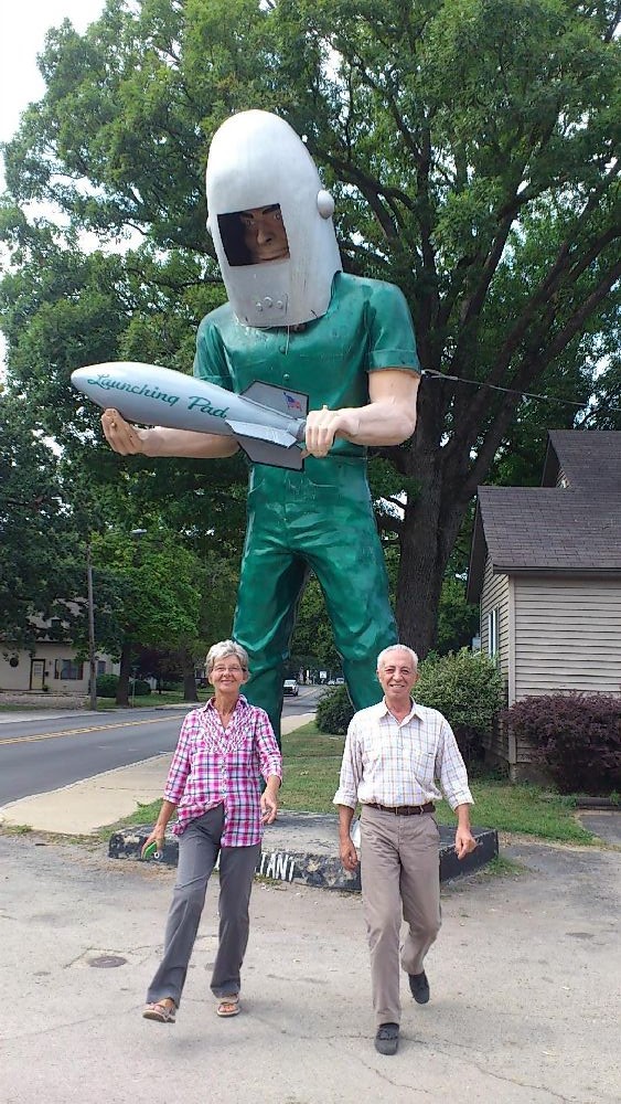 Partenza alle 9.45. Usciamo da Chicago prendendo prima la Lake Shore poi la I55 fino a Wilmington. Usiamo il navigatore per arrivare a Wilmington dove ci fermiamo a fare foto al Gemini Giant (uomo gigante vestito da astronauta). Incontriamo un gruppo di donne sugli anta che hanno fatto un pezzo di Rote 66 in camper. Sono allegre e simpatiche.
