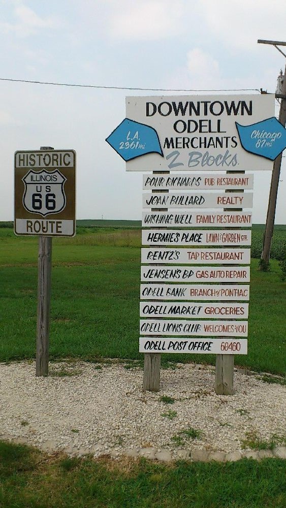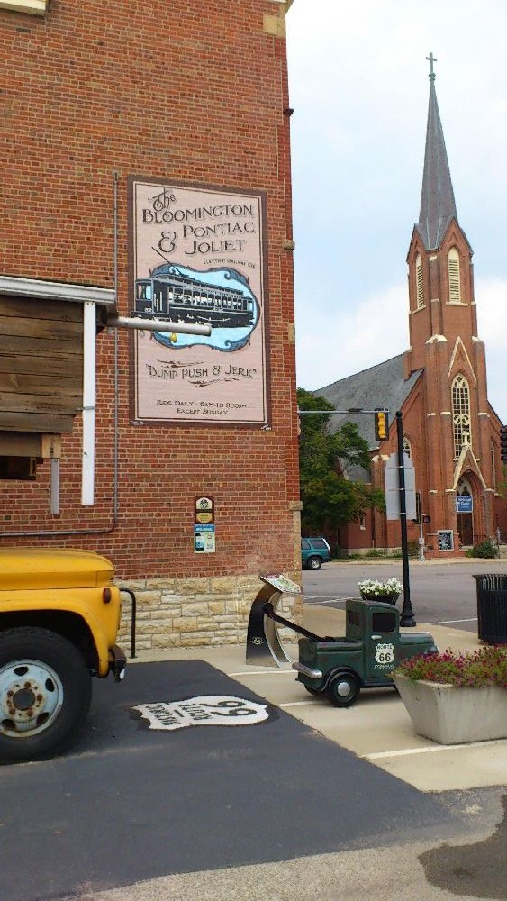 Trovata la Route 66 la seguiamo e passiamo per Braidwood Dwight, dove troviamo vecchie pompe di benzina restaurate, Odel, acora con pompe e dove acquistiamo i primi magneti e cartoline e poi a Pontiac (murales e macchinine in strada). Il paesaggio è bello, verde e con dolci collinette.