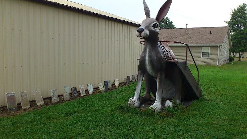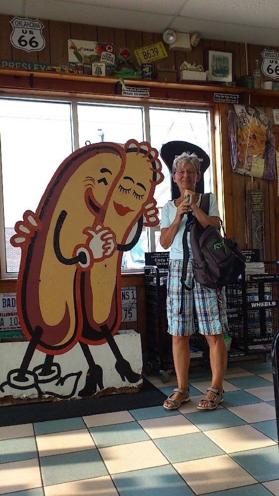 Emozione, facciamo il primo rifornimento self dopo uno studio sul come fare. Mezzo serbatoio prevede circa 30$ per fare il pieno. Riprendiamo la I55 fino all'uscita 41, a Stauton, poi sulla Route 66 con sosta da Henry's Rabit Ranch. Non entriamo a parlare con Henry nè a vedere il grande coniglio rosso ma fotografiamo anche il cimitero dei conigli. Piove e fa caldo. Sempre sulla Route 66 e con l'aiuto del navigatore andiamo a Collinsville per vedere la più grande bottiglia di Ketchup. Ora alle ampie distese verdi si sostituisce un paesaggio mosso, con villette con ampi giardini tutti ordinati e rasati che fanno invidia al Gran Ducato di Marzaglia.