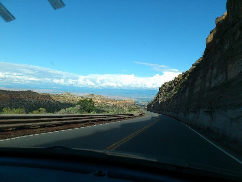 Il tempo è incerto e noi ripartiamo per Santa Fè dove arriviamo alle 14 all'Hotel Days Inn. Ripartiamo subito in auto alla volta di Los Alamos e l'introvabile Bandelier (che dovrebbe essere poco prima di Los Alamos). Il paesaggio è da film Western e le montagne del sangue di Cristo o forse del Rio Grande sono bellissime. Qui sembra sempre di essere in elicottero! Troviamo Bandelier (R4) e ci fermiamo al parcheggio dei bus di collegamento con il sito e cerchiamo i biglietti per il giro ma al Centro turistico ci informano che, poiché è piovuto troppo, le visite sono sospese fino al giorno dopo, almeno!