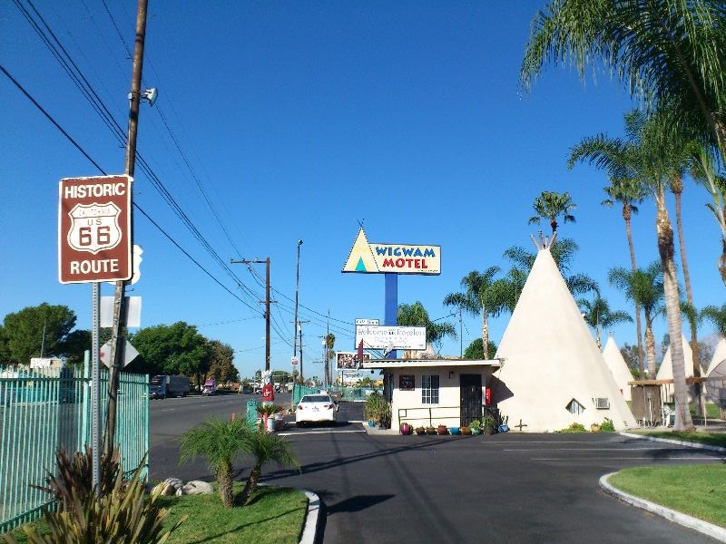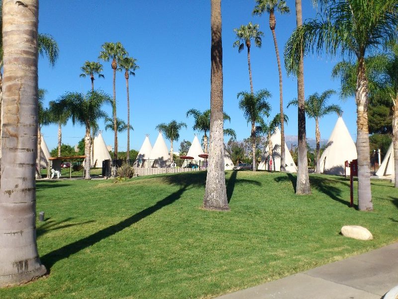 Ripartiamo e passiamo per Victorville. La R66 si interrompe e prendiamo la I15 poi, con l’aiuto del navigatore, arriviamo a S. Bernardino sulla Foothill Boulevard e ci fermiamo al Wigwam Village, i teepees mia grande passione.