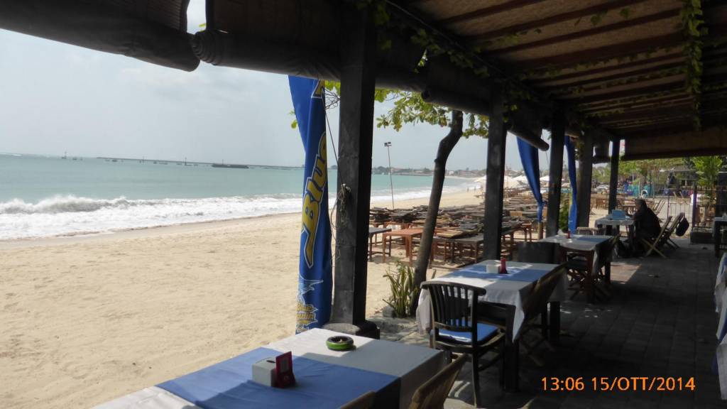 Il caldo umido comincia a farsi sentire. Arriviamo sulla costa. Finalmente mare, bruttone ma mare. Onde grandi, spiaggia di sabbia scura e sporca. La costa è un disastro. Orribile! Andiamo al Tempio di Tana Lot che è veramente suggestivo. Lo vediamo dall'alto perché c'è l'alta marea. Poi decidiamo di andare a pranzo a Jimbaran sulla spiaggia mangiando gamberi, aragosta, granchi e barracuda. Eka ci porta da Blue Marlin. Gran caldo, mangiamo bene ma paghiamo tanto per i costi dell'Isola (30 Euro a testa).