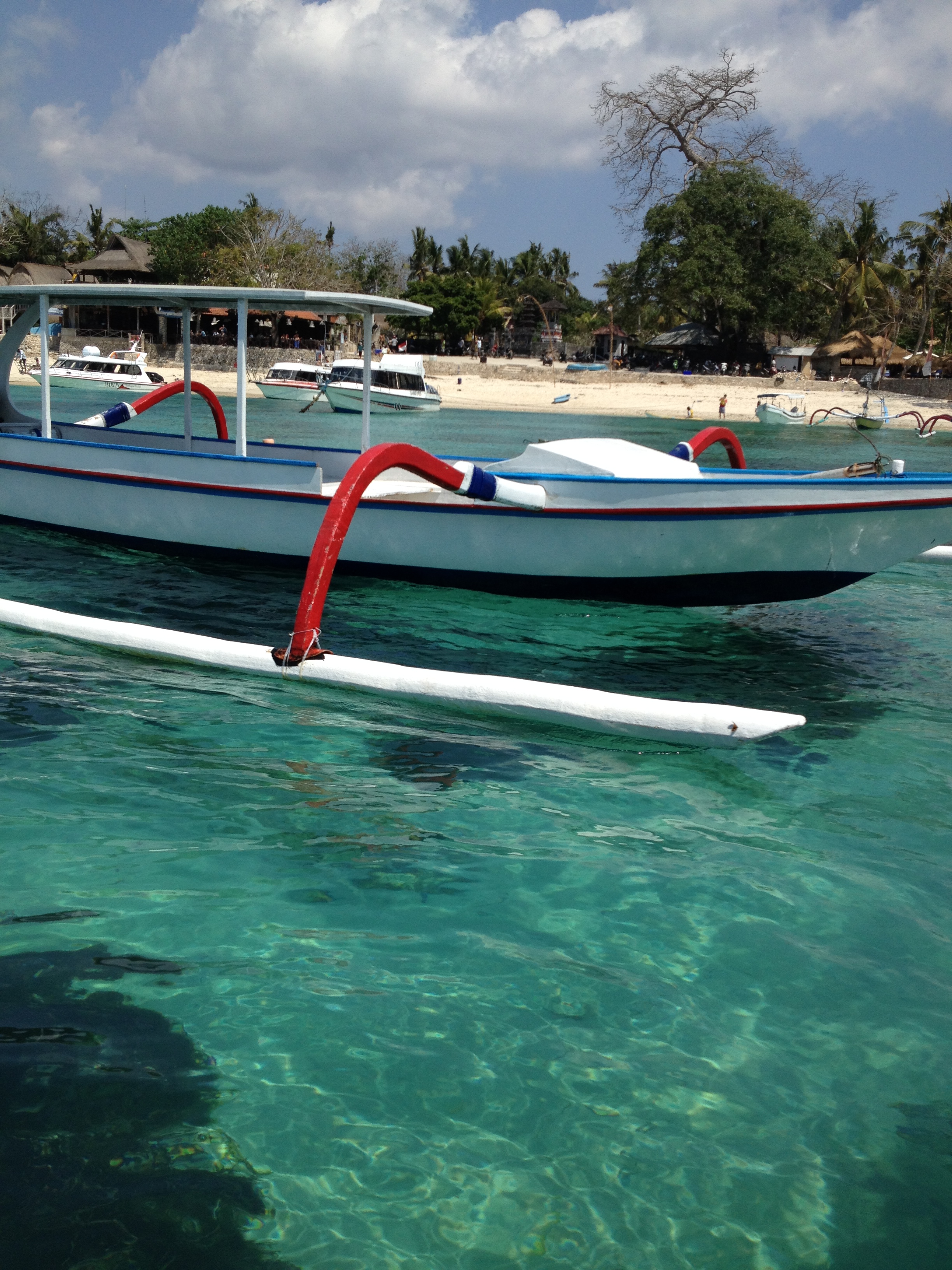Partenza ore 7.30 per la mini crociera all'Isla di Nusa Penida con catamarano (100 Euro a testa) Chi ci deve accompagnare al porto è in ritardo e alcuno si agita. Tutto finisce bene e ci imbarchiamo con 2 arzilli cantanti, giapponesi, coreani, cinesi ... , ma non tanti, e ci propinano una ricca colazione. L'oceano è veramente Pacifico. Dopo quasi due ore di navigazione, indossato il costume, sbarchiamo sull'isola su barche più piccole e via a vedere la barriera corallina. Pinne e maschere fornite dall'organizzazione. I coreani, giapponesi e cinesi montano pinne e maschere con giubbino e intasano la discesa a mare perché hanno paura. Le ragazze indossano vestitini da bagno con calzoncini, maglietta e gonnellino. Patetico perché sono giovani! Lo snorkeling avviene in una specie di recinto da cui scappiamo subito nonostante le raccomandazioni. Bei pesciotti colorati a righe, uno con unicorno, alcuni mezzi gialli e poi, senza occhiali da vista scambio due sub con pinne fosforescenti che girano sul fondo per enormi pesci colorati. L'acqua è gelida, specie se si prova a scendere. Bello!