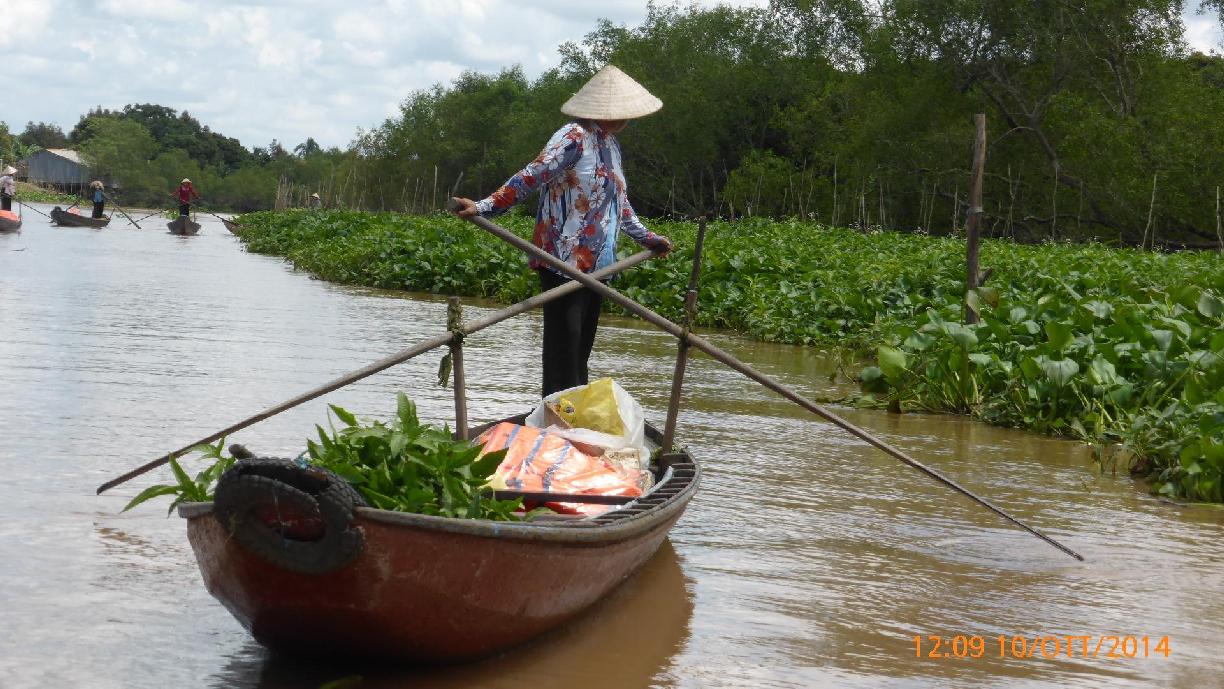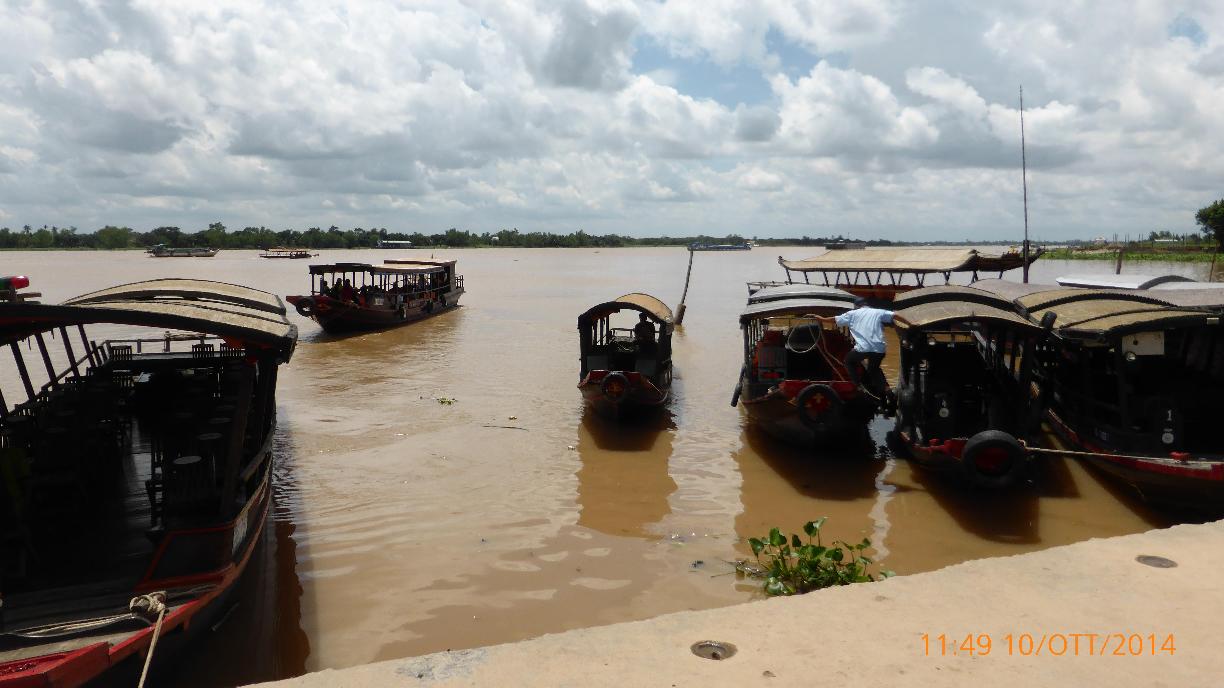 Il Delta del Mecong � affascinante. L'acqua � torbida sul rossastro ma i locali non sembrano accorgersene e si fanno docce pi� o meno vestiti. La vita si svolge su e lungo il fiume. Dopo una prima barca a motore abbiamo proseguito con piccole barche a remi, portate da donne, fino a Cai Be. Di nuovo barca grande e visita al Mercato galleggiane. Minh ci spiega che la concorrenza � minima e che ciascuno pensa a s�. L S. si documenta sulle forme cooperative ma di nuovo viene risposto che non sono praticate.
