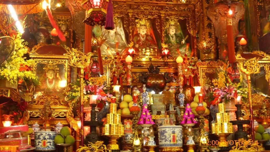 Poi il Tempio Buddista privato dove vediamo il "danaro degli Spiriti" e al primo piano dolci, frutta e verdura e tante decorazioni in oro, pacchiane e pesanti. Loro pregano, o sembra che lo facciano, ma il clima � pi� da fiera che altro.