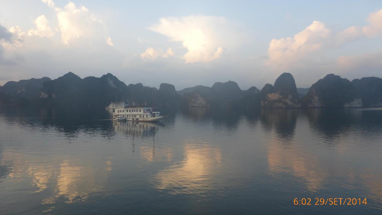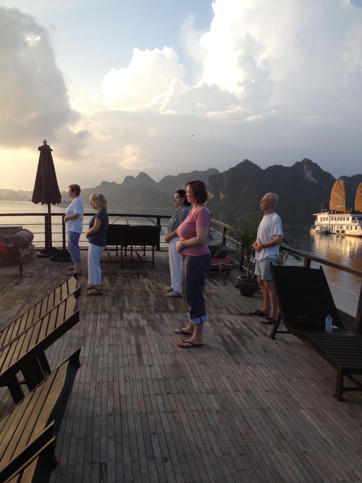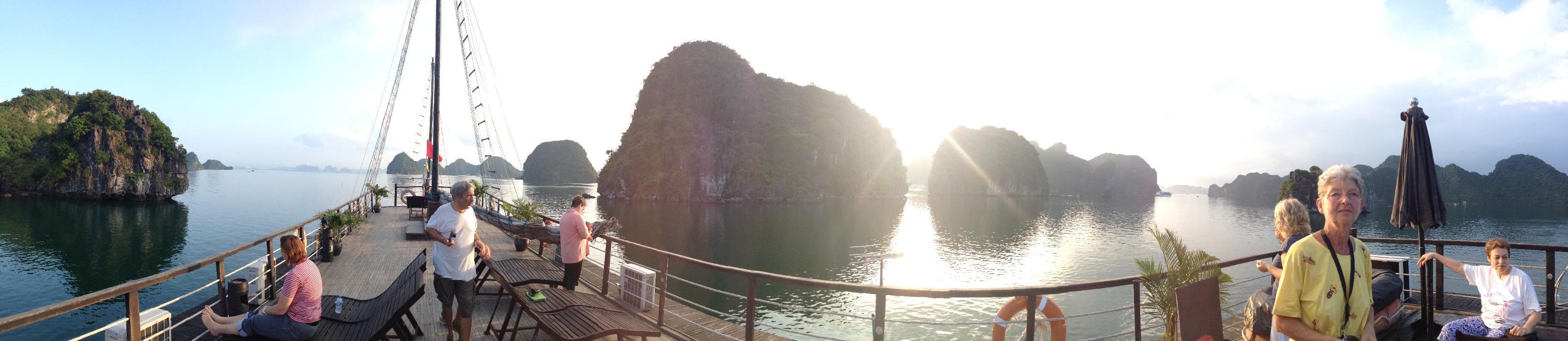 Dopo taichi con il cuoco e poi con la Maestra L, facciamo colazione, poi la barca riparte e noi ci godiamo il panorama prima con il sole poi sotto un acquazzoncino.