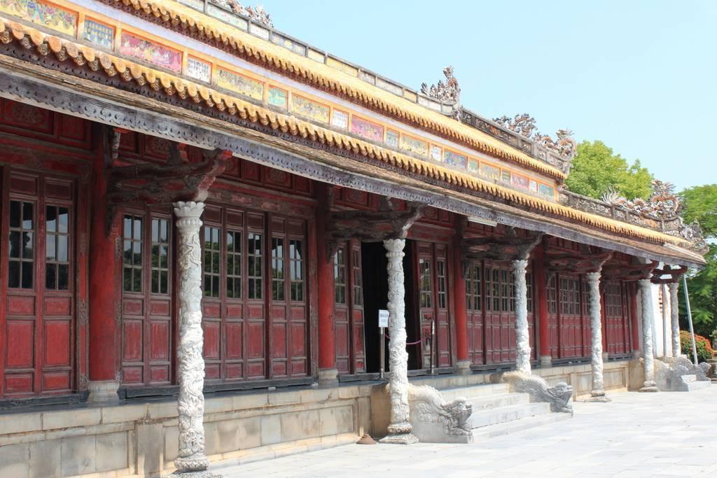 Ripartiamo in pulmino alla volta della cittadella di Hu� con mura e fossato e Porta di Mezzogiorno (Porta Ngo Mon). Ci sono 9 cannoni sacri che non hanno mai sparato. La costruzione risale al 1804-1833. Quattro di questi rappresentano le 4 stagioni e 5 gli elementi (metallo, legno,acqua, fuoco e terra). All'interno il recinto imperiale con gli edifici pubblici e all'interno ancora la "citt� purpurea proibita", con proprie mura, i gran parte in restauro, e visitiamo la sala di lettura, il teatro, l'area delle concubine e eunuchi e il Tempio di Tomieu (Padiglione delle cinque Fenici, il Palazzo della Pace Suprema, il Tempio Dinastico The Mieu: edifici disposti in un armonioso succedersi secondo i principi sanciti dalla scienza geomantica cinese).