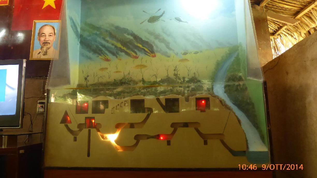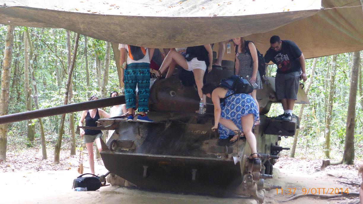 Arriviamo a CU CHI col sole e la visita inizia con una sosta alla 'casa della felicit� dove si pu� liberare la tristezza' (WC). Poi un filmato del 1967 'I partigiani di CU CHI'. Nella sala del filmato troneggiano due scritte: "Nulla � pi� prezioso della libert� e indipedenza" e "Avanti, noi raggiungeremo la vittoria", sono scritte in vietnamita e la guida traduce. Poi proseguiamo con la visita ai tunnel con sperimentazione ad entrare e a percorrerne piccoli pezzi. Bombe, carri armati, VietCong, trappole e ingressi a cunicoli, cunicoli cucina, sale riunioni, infermeria e tanti americani!