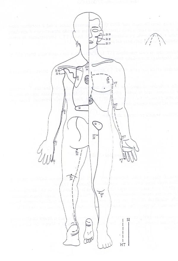 S Sul Sul braccio � tra C e MC, quindi si tratta con braccio a 112,5 nel ventre mediale del bicipite fino all'anulare. Nella gamba, corre sul vecchio decorso di R, ma sotto il tendine; 1) gamba piegata col piede + alto possibile (sopra il ginocchio) di fronte, con m.m. sul ginocchio, 2) oppure dall'altra parte con m.m. su hara, tirando sotto il tendine con le dita 3) oppure col piede in braccio, come R tradizionale.