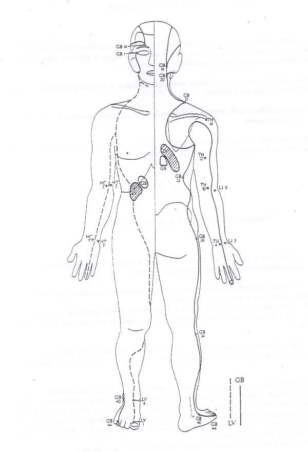 2) piegata col piede sotto il gluteo, col ginocchio un po' alzato e sostenuto.P schiena con palmo o ginocchio o avambraccio, solo sulle coste, a lato della scapola VESCICOLA BILIARE secondo Masunaga decorso schema