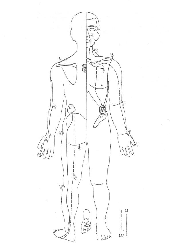 S dalle aree diagnostiche, allargo la mia gamba esterna tratto il pezzo sopra le coste col taglio della mano arrivato a 3cun, salgo verticalmente col taglio della mano fino al I� spazio, alzandomi in ginocchio tratto col palmo la parte orizzontale fino a P1 coscia: sollevare il suo ginocchio e gamba, puntare e spingere il ginocchio verso la sua spalla opposta: trattare seduti sui talloni push-pull col ginocchio in direzione come sopra la gamba si pu� trattare in vario modo: push-pull come vescica: in seiza all�interno con direzione sua spalla opposta, bloccando il piede a terra; alla caviglia mi sposto all�esterno e lavoro col pollice la caviglia dietro il malleolo poi appena sotto il bordo del piede; infine pinzo il punto finale (appena sopra a R1) o, meglio, distendo la gamba e prendo il piede in braccio. INTESTINO CRASSO secondo Masunaga