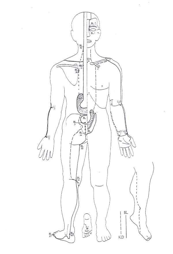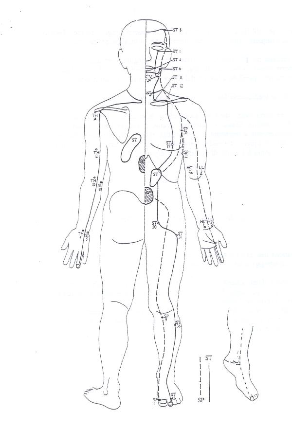 P lavoro generale sul dorso per sciogliere: dondolare la schiena pinzare le vertebre con la punta delle dita e vibrare kembiki: impastare i m paravertebrali con la base della mano (usare hara e non su kyo) S si fa il giro completo trattando entrambi i meridiani (o anche uno solo) coste: col taglio della mano, in arcere torace: a 4 dita dal centro fino a P1 braccio: P, rotazioni, trazioni, IC con avambraccio dalla testa: lavorare il I� spazio, poi il collo altro braccio finire su P1, poi su hara rotazione anca IC coscia: gamba piegata in alto come per VB, piede all'altezza del polpaccio, da trattebere perch� scivola, oppure IC coscia: gamba piegata in alto, ginocchio incrociato verso l'altra mano, trattare col ginocchio stando sui talloni IC gamba: gamba piegata col piede a terra: trattare col pollice IC piede: molto basso rotazione P coscia: gamba piegata in alto, angolo verso la spalla opposta, dal davanti, sulle punte, come V P gamba: come V, P piede: subito sotto il bordo pianta del piede: terminare P e IC trazioni e altra gamba STOMACO secondo Masunaga decorso schema