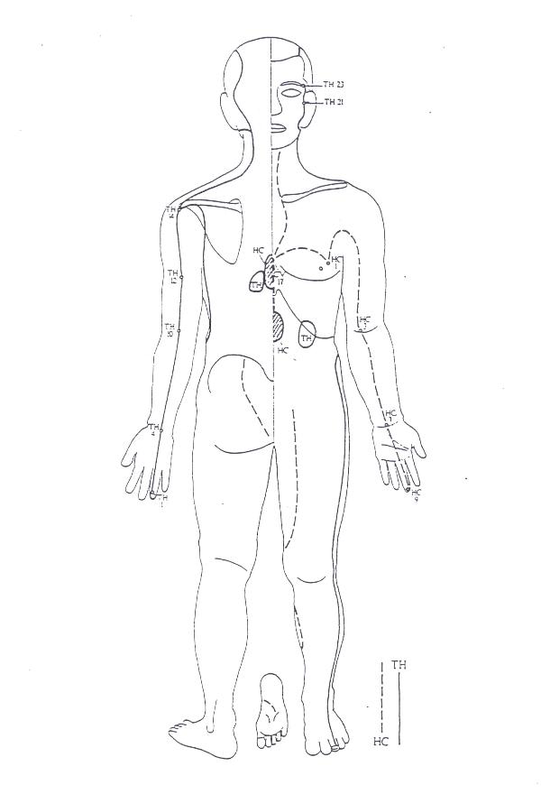 S braccio a terra a 67,5�, dall'esterno con palmo e pollice in seiza a 45� (come per P) contro la faccia esterna del bicipite e sul tendine del gomito, poi sulle punte verticale sul fianco dell'osso e fino all'indice. Il rametto sul piede va trattato, anche con mm quando si tratta M sulla coscia. ricordiamo il trattamento sul decorso tradizionale: